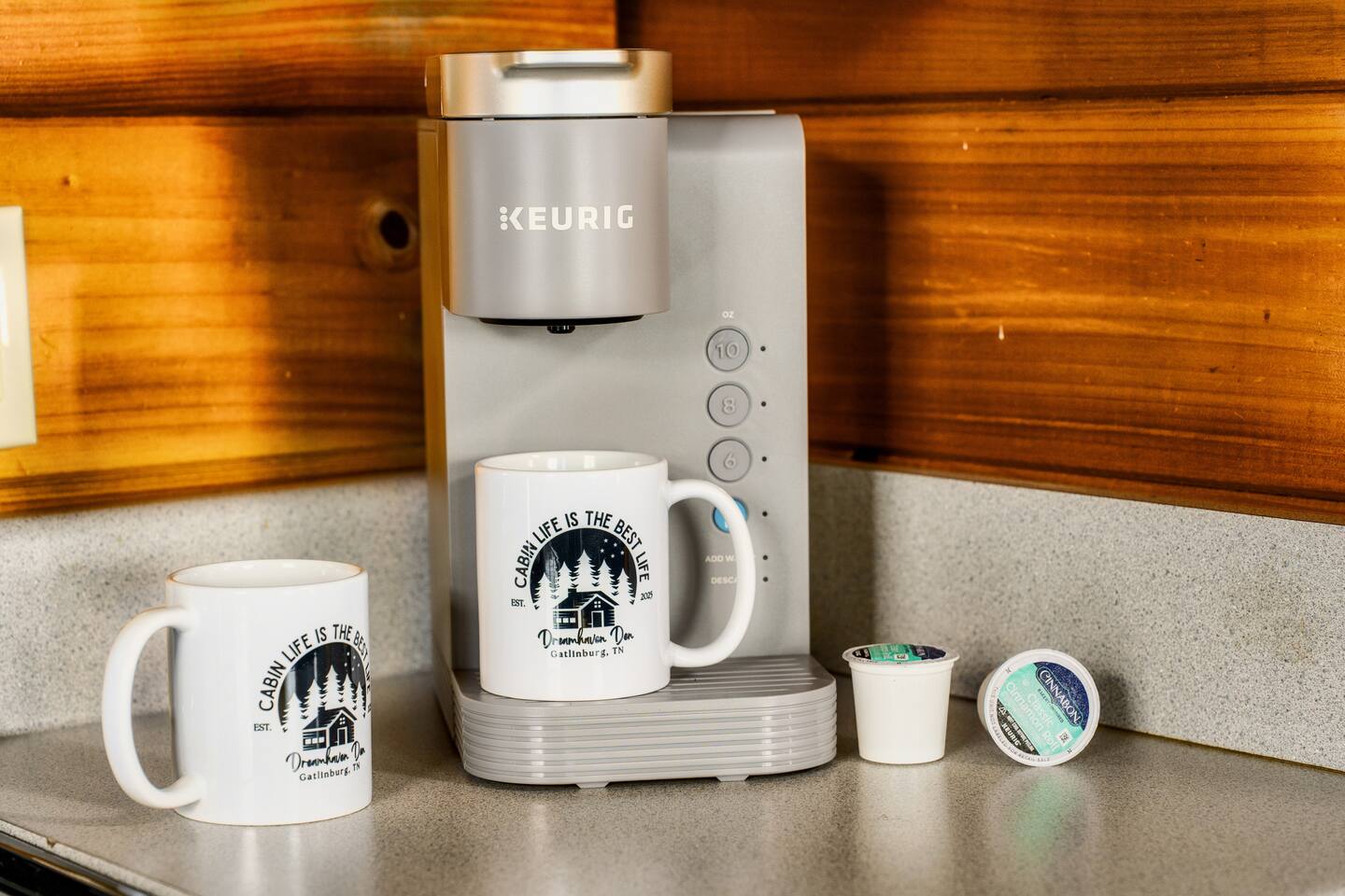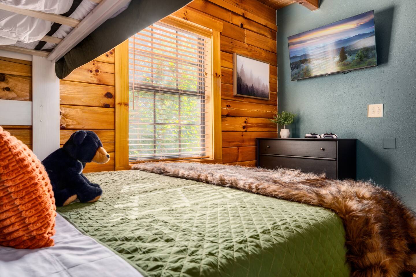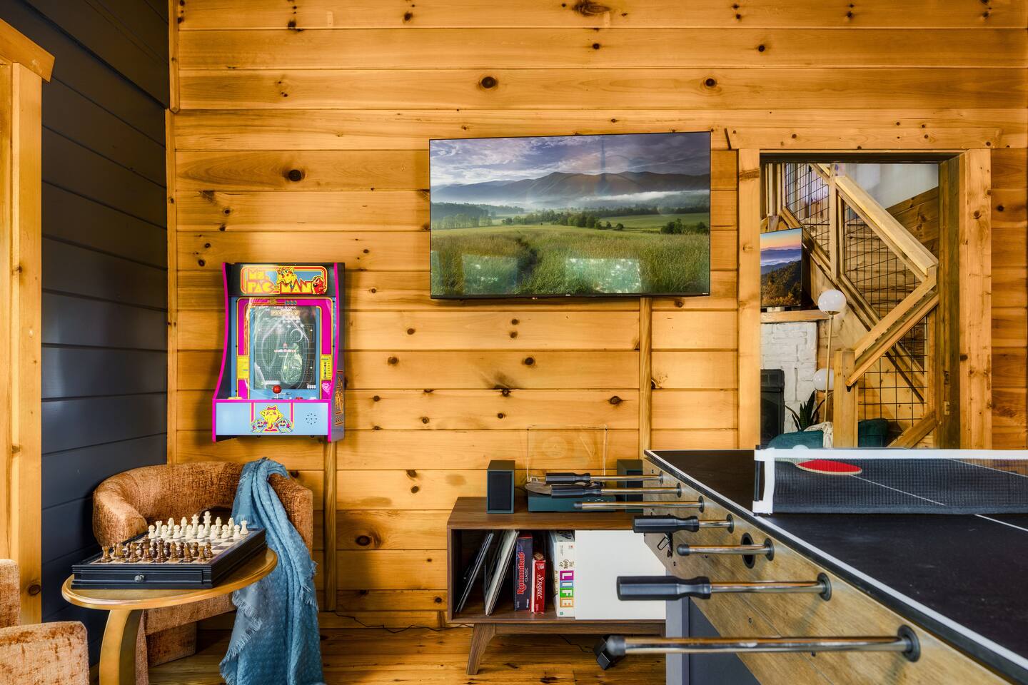 ~Prime Location~ Dreamhaven Den gives you the perfect mix of peace and proximity. Nestled in a quiet, gated community surrounded by trees, you’ll be just 3 miles from downtown Gatlinburg — close enough to enjoy all the shops, dining, and attractions, yet far enough to escape the crowds when you’re ready to unwind. You'll love... ~ Only 3 miles to downtown Gatlinburg’s restaurants, distilleries, and shops ~ Peaceful gated community with a seasonal outdoor pool ~ Wooded surroundings that feel private and serene ~ Just minutes to the Gatlinburg Welcome Center & Trolley park-and-ride for stress-free access to town and the National Park ~Open Living Space~ Gather in the heart of the cabin, where the spacious sectional invites cozy movie nights, late-night chats, or curling up by the fire after a day of exploring. The open layout makes it easy for everyone to stay connected — whether some are cooking, some are watching TV, or others are playing games at the table. You'll love... ~ Large sectional sofa for group seating ~ Gas fireplace (Oct–Mar) for mountain nights ~ 55" Roku TV for movies and shows ~ HDMI extension for easy connection of your own game console ~ Open-concept design for togetherness ~Fully Stocked Kitchen/Dining~ Cook, snack, and sip with ease in the fully stocked kitchen. Whether you’re making a big family breakfast before a hike or pouring wine for a late-night card game, everything you need is right at hand. The dining table is large enough to comfortably seat your group for meals or games. You'll love... ~ Full-size fridge, oven, stove, dishwasher, and microwave ~ Coffee connoisseur's dream with Keurig (hot/iced), drip maker, Chemex, French press, Italian espresso style coffee maker (Moka pot) and handheld frother wand ~ Starter supplies including salt and pepper grinders, olive oil, sugar, small creamers and various other spices ~ Cookware, bakeware, and utensils for family meals ~ Large dining table that seats 8 ~Comfortable Bedrooms~ At the end of the day, each bedroom offers a comfortable retreat where everyone can relax and recharge. Two king suites give plenty of privacy and comfort, while the queen and bunk rooms provide flexible options for families or groups of friends. You'll love... ~ Roku TVs and ceiling fans in every bedroom ~ Updated cozy luxe bedding ~ Bedroom #1 (Upstairs): King bed with ensuite bath + reading nook with twin pull-out chair for flexible sleeping options ~ Bedroom #2 (Main Level): King bed, large wall of windows overlooking gorgeous mountain views, dedicated workspace and private hot tub deck access ~ Bedroom #3 (Main Level): Queen bed with mountain mural near main living area ~ Bedroom #4 (Main Level): Twin-over-queen bunk with game stick with over 10,000+ retro games ~ Bathrooms: 2 total — step-in shower downstairs, bathtub upstairs ~Inviting Outdoor Spaces~ Step outside and let the mountains do the rest. Sip coffee on the porch swing, share cocktails around the fire table, or soak in the hot tub as the sun sets. With both lounge seating and bar-style seating, the deck is a natural gathering spot. You'll love... ~ Screened-in hot tub with mountain views and cozy swing chair ~ Fire table with lounge seating ~ Porch swing + rocking chairs for quiet mornings ~ Bar seating on the deck overlooking the view ~ Park-style charcoal grill for cookouts (guests supply their own charcoal) ~Fun Game Lounge~ Tucked away with a speakeasy vibe, this space is where fun happens. Play classic arcade games, challenge friends at foosball or ping pong, or spin records while sipping drinks at the bar. It’s perfect for rainy days or late-night hangouts. You'll love... ~ Ms. Pac-Man arcade machine with 12 classic games ~ Foosball/air hockey/ping pong combo table ~ Record player complete with a collection of classic records and Bluetooth speakers for music options ~ Lounge seating + smart TV + bar setup ~ Board and card games included House Rules: We want your stay at Dreamhaven Den to be as relaxing as possible. To keep things comfortable for everyone, please keep these simple rules in mind: ~ No pets (we love them, but this cabin is pet-free) ~ No smoking or parties — let’s keep the cabin fresh and peaceful ~ Please respect quiet hours (10pm - 8am) and our neighbors in this gated community ~ Children must be supervised around the hot tub and fire table