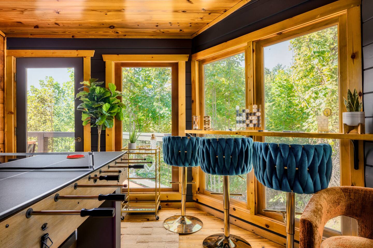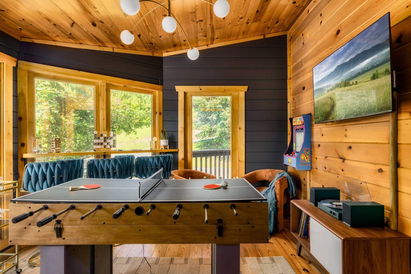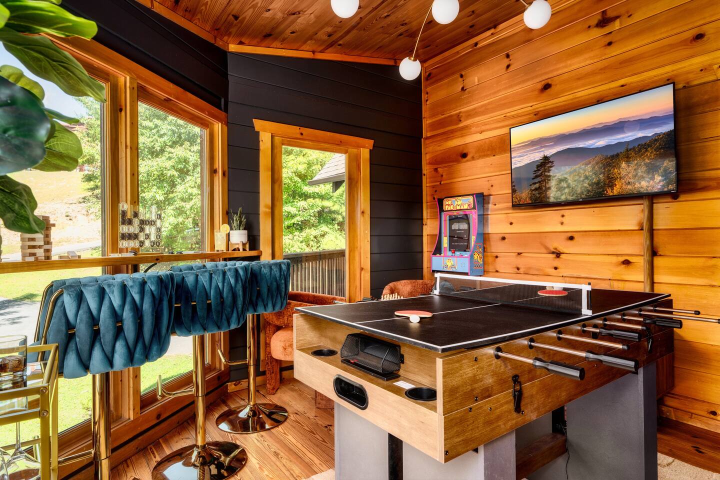 ~ Peaceful wooded setting just 3 mi to downtown Gatlinburg, 7 mi to National Park, 8 mi to Pigeon Forge, 9 mi to Dollywood ~ Deck with mountain views, screened hot tub, fire table lounge, and bar seating ~ Speakeasy-style game lounge with combo game table and arcade ~ Updated bedrooms w/Roku TVs, luxe textiles, flexible sleeping for up to 10 (best for 4–8 adults + kids) ~ 5G internet, Roku TVs, game stick w/10k+ retro games, HDMI extension for your system, and a dedicated workspace